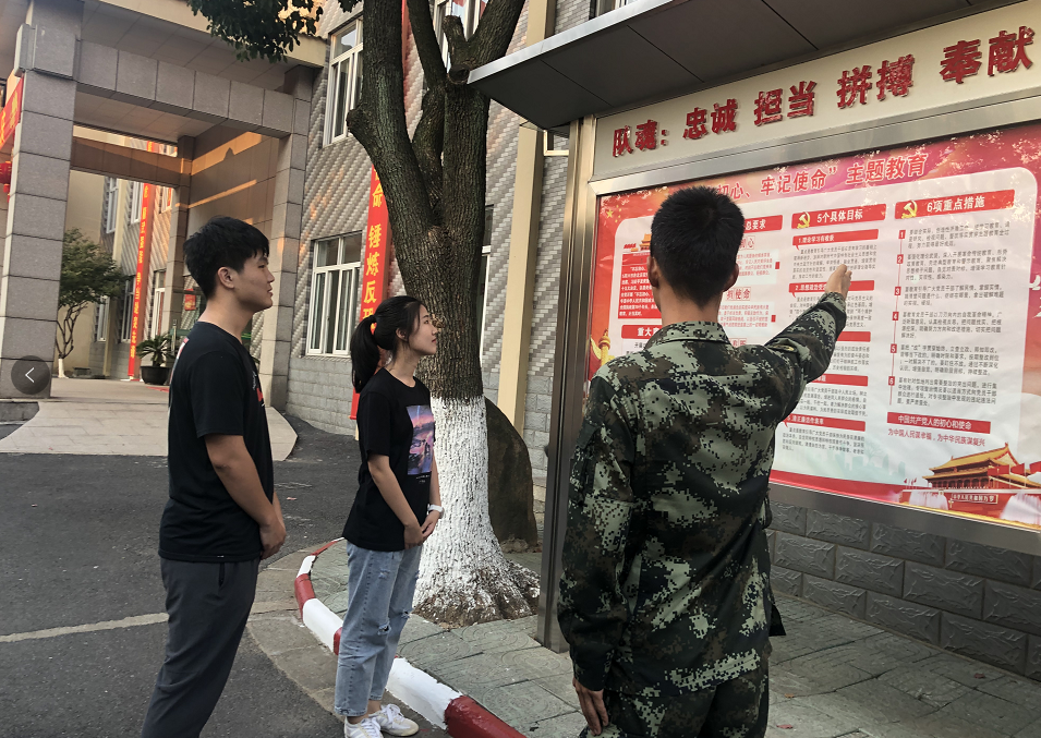 首先,同学们与武警湖州支队的战士们精心准备了节目,共同为祖国母亲献上七十华诞最美的祝福。理学学子舞蹈《映山红》,表现了红军坚定信念,不服输的精神;歌舞《我和我的祖国》表达了理学学子对祖国的真诚歌颂,节目得到了在场领导和战士们热烈的掌声。随后,军衔晋升仪式上战士们英勇的事迹,敢打敢拼、敢为人先的精神,感染着在场的每一名员工党员和入党积极分子。文艺汇演结束后,同学们来到湖州武警支队某中队,开展了“不忘初心,牢记使命”的主题教育,并参观了荣誉室,了解中队的光荣历史;中队指导员结合“传承红色基因,担当强军重任”主题教育,对同学们进行了爱国主义教育。