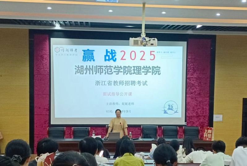 为帮助2025届同学们更好地了解教师编提前批招考形式、考查内容与方式,并提供备考复习规划和资源分享,为同学们顺利备考提供有力支持。2024年9月22日晚,太阳集团tyc在理学之光举办2025年浙江省教师招聘考试面试指导讲座。本次讲座由博越师考金牌讲师李老师主讲。学院本科生和研究生60余名名同学参加讲座。