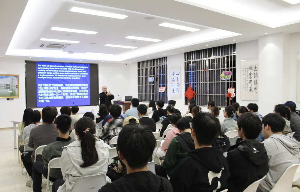 活动伊始,罗伯特院士从家乡谈起,分享了自己的求学和工作历程。他回忆了中学时开始思考很多物理问题,也正是这些问题激发了他对物理学的兴趣,并坚定了成为物理学家的决心,他强调“兴趣是最好的老师”。罗伯特院士讲述了自己志愿教学的经历:早晨六点或晚上十点,总会有员工敲门求助,无论何时,他的员工们总有问题需要解答。他鼓励同学们要时刻保持怀疑,在学习中永远不要固步自封,有疑问便要勇敢地去敲响求知的大门。罗伯特院士充满热情地为同学们介绍了他的研究领域,他用深入浅出的话语,将复杂的科学原理阐述的通俗易懂,使员工们受益匪浅。罗伯特院士精彩的分享让在场的师生无不感受到他严谨的治学态度、开阔的科研思路和丰富的工作阅历。